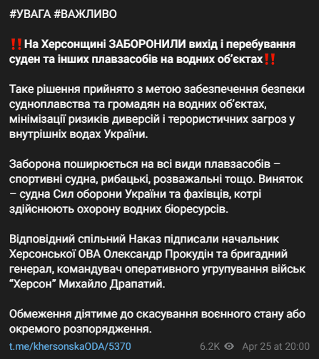 В Херсонской области запретили выход и пребывание на воде лодок и других плавсредств.