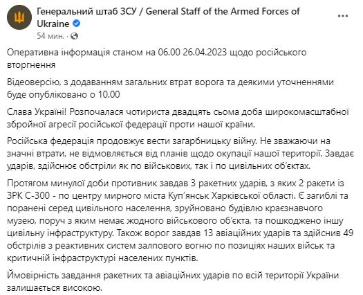 В среду, 26 апреля, Генштаб ВСУ обнародовал сводку о ситуации на фронте за минувшие сутки.