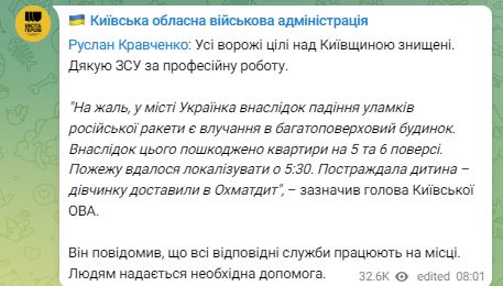 "В результате повреждены квартиры на 5 и 6 этаже. Пожар удалось локализовать в 5:30. Пострадал ребенок - девочку доставили в Охматдет", - заявил председатель Киевской ОВА.