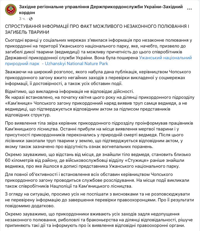 "В ходе выяснения обстоятельств инцидента, сопоставления фото- и видеоматериалов ... был сделан вывод, что речь идет об одном и том же медвежонке. В результате проведенной работы получена информация, которая дает основания считать, что медведица была уничтожена в результате незаконной охоты, организованной и осуществленной должностными лицами ГПС Украины", - говорится в заявлении нацпарка.
