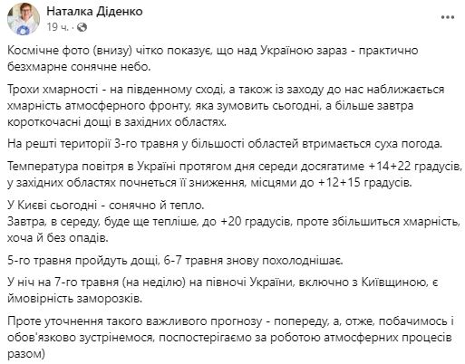 Синоптик Наталья Диденко пишет, что сегодня возможны кратковременные дожди в западных областях. На остальной территории 3 мая в большинстве областей сохранится сухая погода.