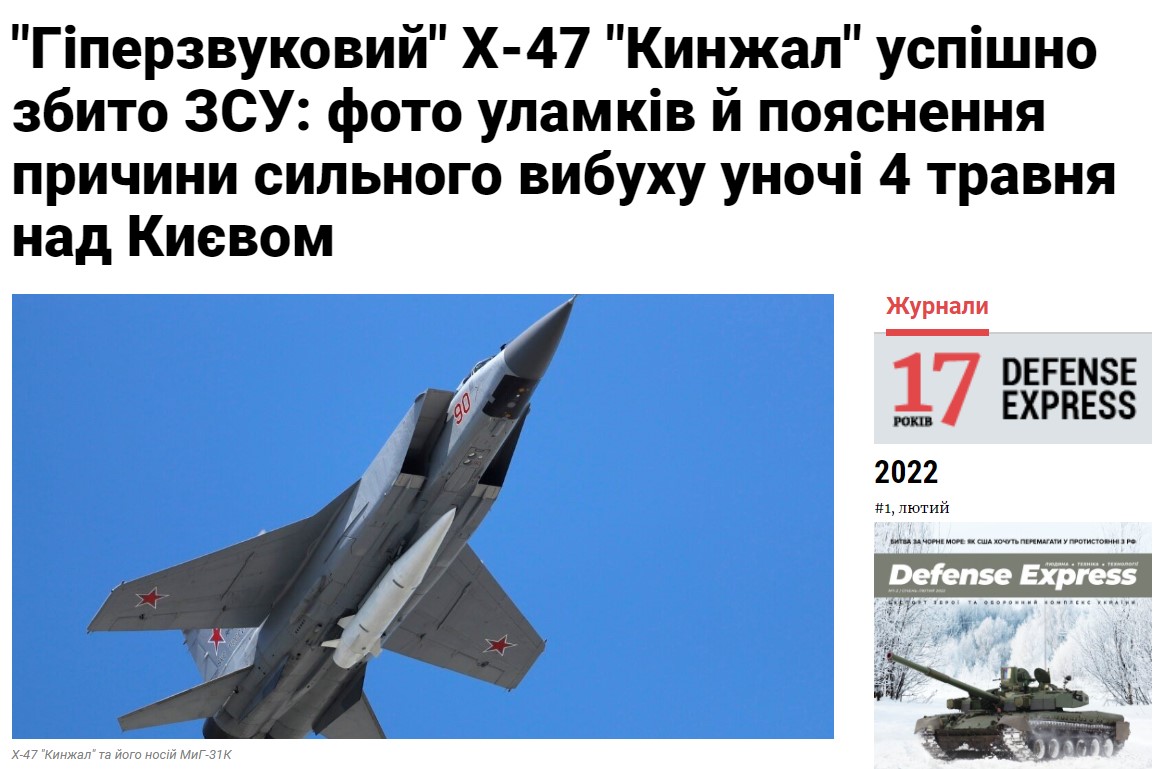 Военный портал Defense Express утверждает, что в ночь на 4 мая ВСУ сбили "Кинжал" над Киевом
