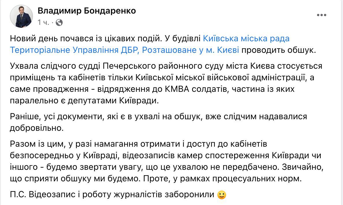 Об сообщил заместитель мэра Владимир Бондаренко. По его словам, обыски касаются городской военной администрации, а не Киевсовета.