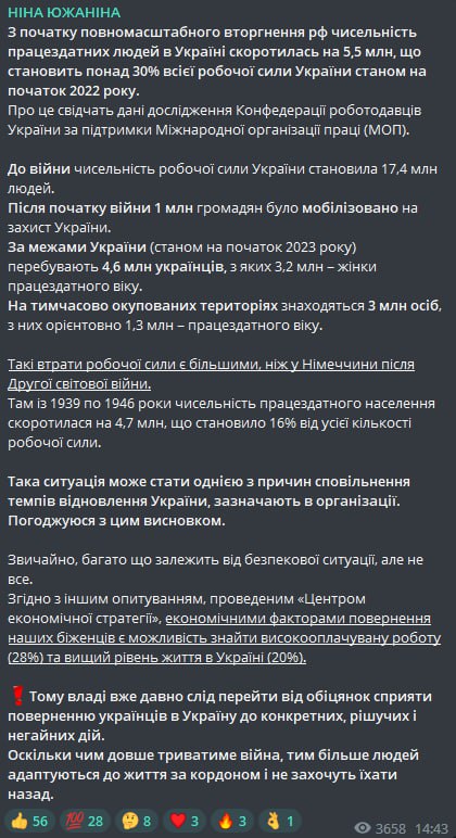 09.40 Число трудоспособных украинцев с начала вторжения сократилось на 5,5 миллионов человек или на 30%.
