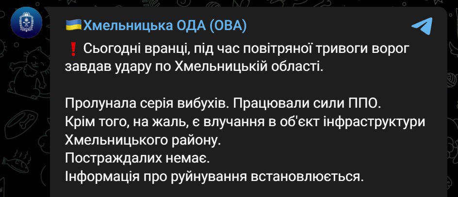 "К сожалению, есть попадание в объект инфраструктуры Хмельницкого района. Пострадавших нет. Информация о разрушении устанавливается", - говорится в сообщении.