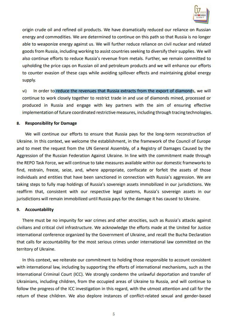 "Чтобы уменьшить доходы, получаемые Россией от экспорта алмазов, мы будем продолжать тесно сотрудничать, чтобы ограничить торговлю и использование алмазов, добываемых, обработанных или произведенных в РФ, и будем сотрудничать с ключевыми партнерами с целью обеспечения эффективной реализации будущих скоординированных ограничительных мер, в том числе с помощью технологий отслеживания", - говорится в заявлении.
