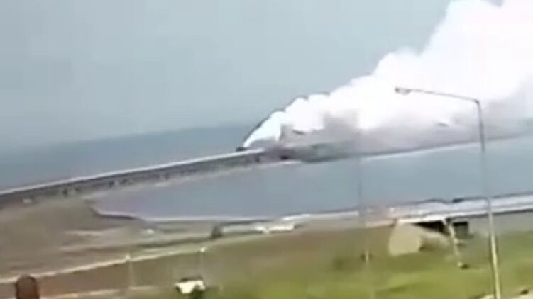 На Крымском мосту, где якобы проходили учения, виднеется дым. Фото: скриншот с видео