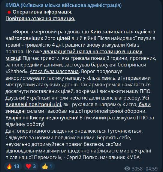 Сегодня ночью после четырехдневной паузы Киев снова атаковали дронами. Все цели были уничтожены силами ПВО. По предварительным данным, применялись "Шахиды".
