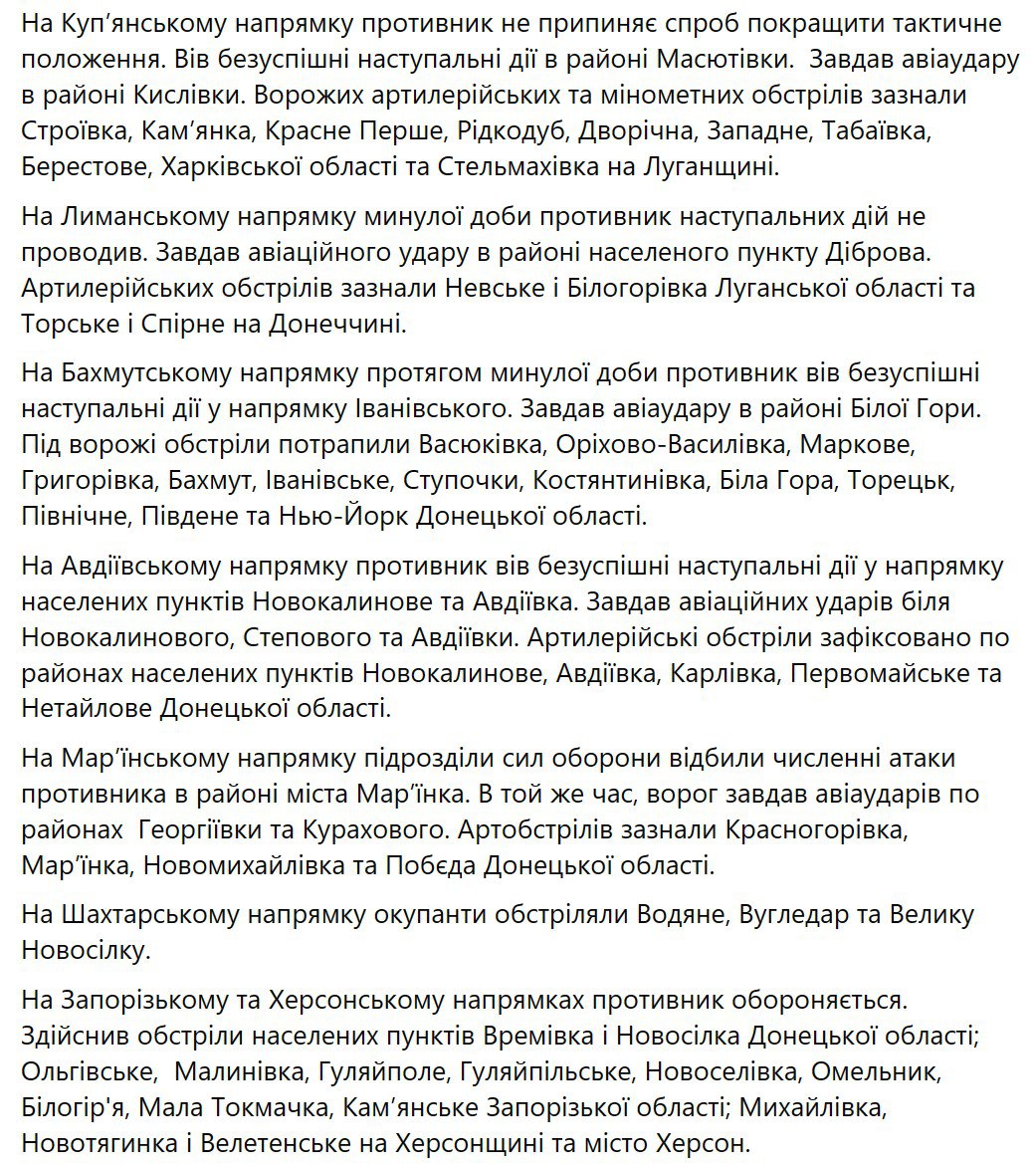 На Бахмутском направлении пытался наступать на Ивановское (Бахмут упоминается только в списке населенных пунктов которые были обстреляны).