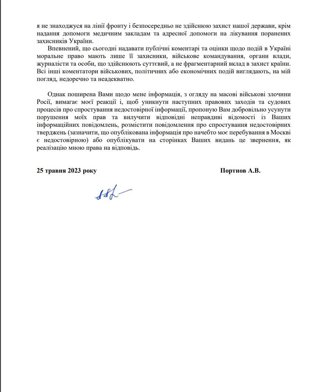 "Моя позиция известна сотням людей, с которыми я ежедневно общаюсь: я считаю, что президент РФ, российские чиновники, российские войска и граждане РФ совершили и продолжают совершать в отношении нашего государства и граждан ужасные военные преступления", – заявил Портнов.