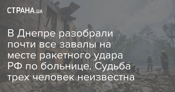 В Днепре на месте ракетного удара по больнице разобрано 90% завалов. Поисковые работы продолжаются. Неизвестна судьба ещё трёх человек.