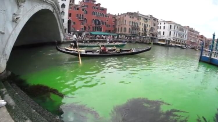 В знаменитом Гранд-канале Венеции вода внезапно окрасилась в яркий зеленый цвет. Власти ищут причину