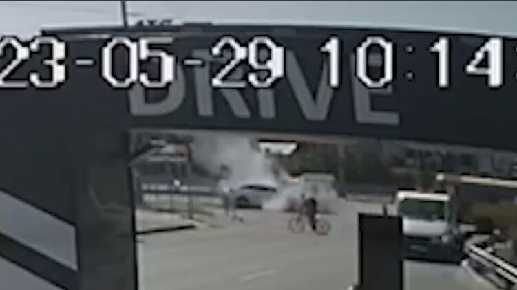 В сети появилось видео падения обломка ракеты на проезжую часть в Киеве во время сегодняшней дневной атаки.