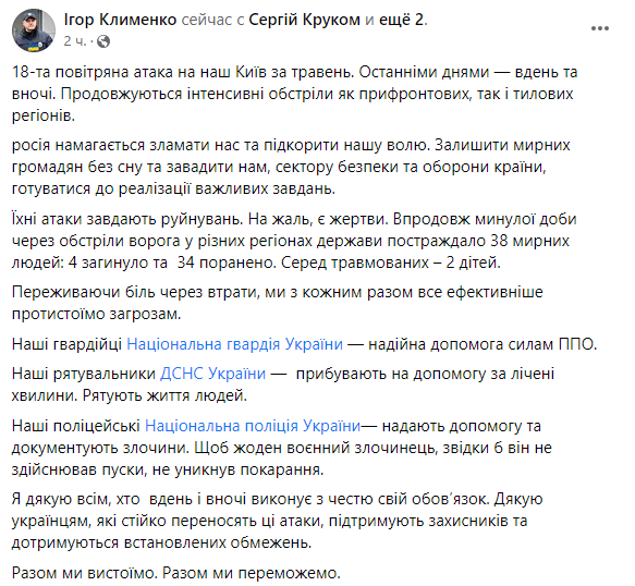 По словам Клименко, в мае было уже 18 воздушных атак на Киев, которые осуществлялись, как днем, так и ночью. Украинцы продолжают ощущать интенсивные обстрелы как на передовой, так и в тыловых регионах.