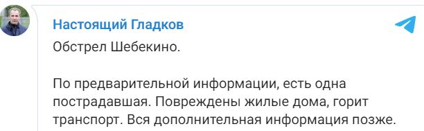 "Обстрел Шебекино. По предварительной информации, есть одна пострадавшая. Повреждены жилые дома, горит транспорт. Вся дополнительная информация позже" - написал он ночью.