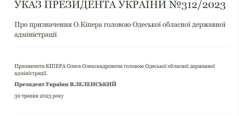 Президент подписал указ о назначении Олега Кипера главой Одесской областной военной администрации, ранее его кандидатура была согласована Кабмином.