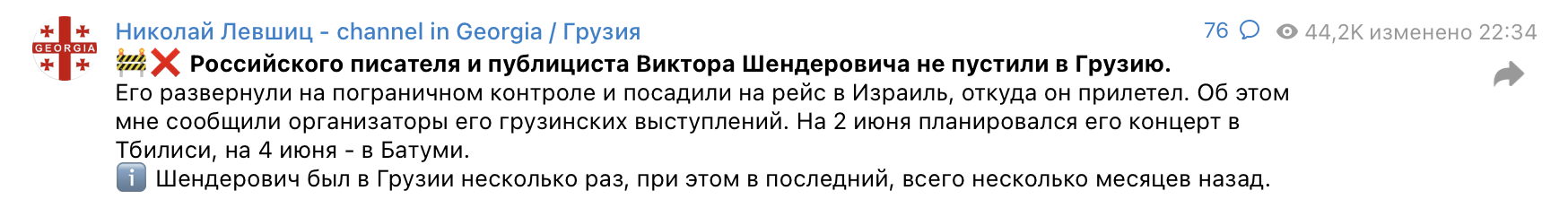 По словам Левшица, Шендеровича "развернули на пограничном контроле и посадили на рейс в Израиль, откуда он прилетел". Он отметил, что последний раз в Грузии писатель был несколько месяцев назад.