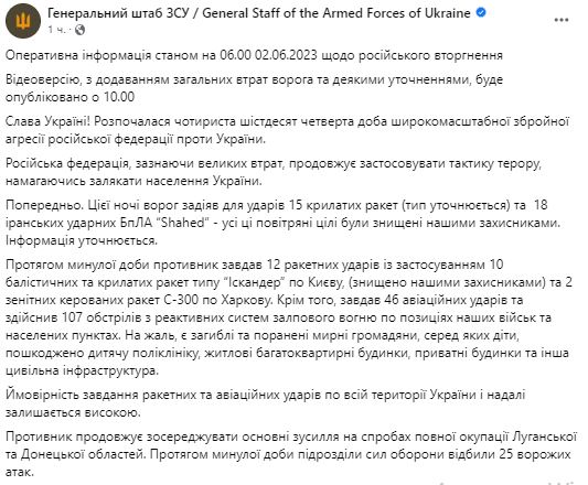 В пятницу, 2 июня, Генштаб ВСУ обнародовал сводку ситуации на фронте.