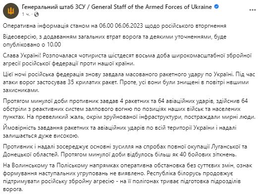 2. За прошедшие сутки противник нанес 4 ракетных и 64 авиационных ударов, совершил 64 обстрела из РСЗО. Есть разрушения и погибшие.