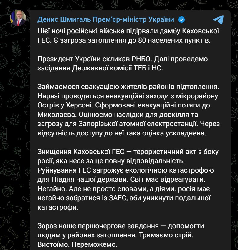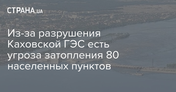 Из-за разрушения Каховской ГЭС есть угроза затопления 80 населенных пунктов.