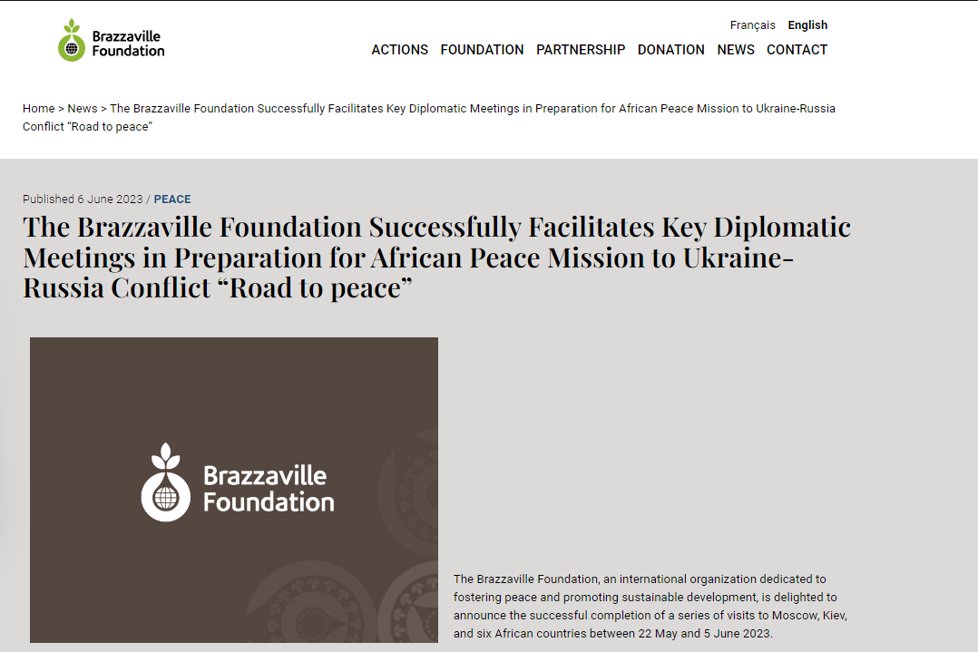 "Подготовительная работа в рамках мирной миссии стран Африки "Дорога к миру" по урегулированию в Украине завершена, она проводилась с 22 мая по 5 июня. Поездка лидеров в Россию и в Украину состоится до конца июня 2023 года. В ходе виртуальной конференции между главами государств [ряда африканских стран] и Brazzaville Foundation, состоявшейся 5 июня, была достигнута договоренность о том, что координация визита африканских лидеров [в Москву и Киев], включая материально-технические и дипломатические аспекты, будет осуществляться по дипломатическим каналам соответствующих стран", - говорится в коммюнике организации, опубликованном в среду в ЮАР.