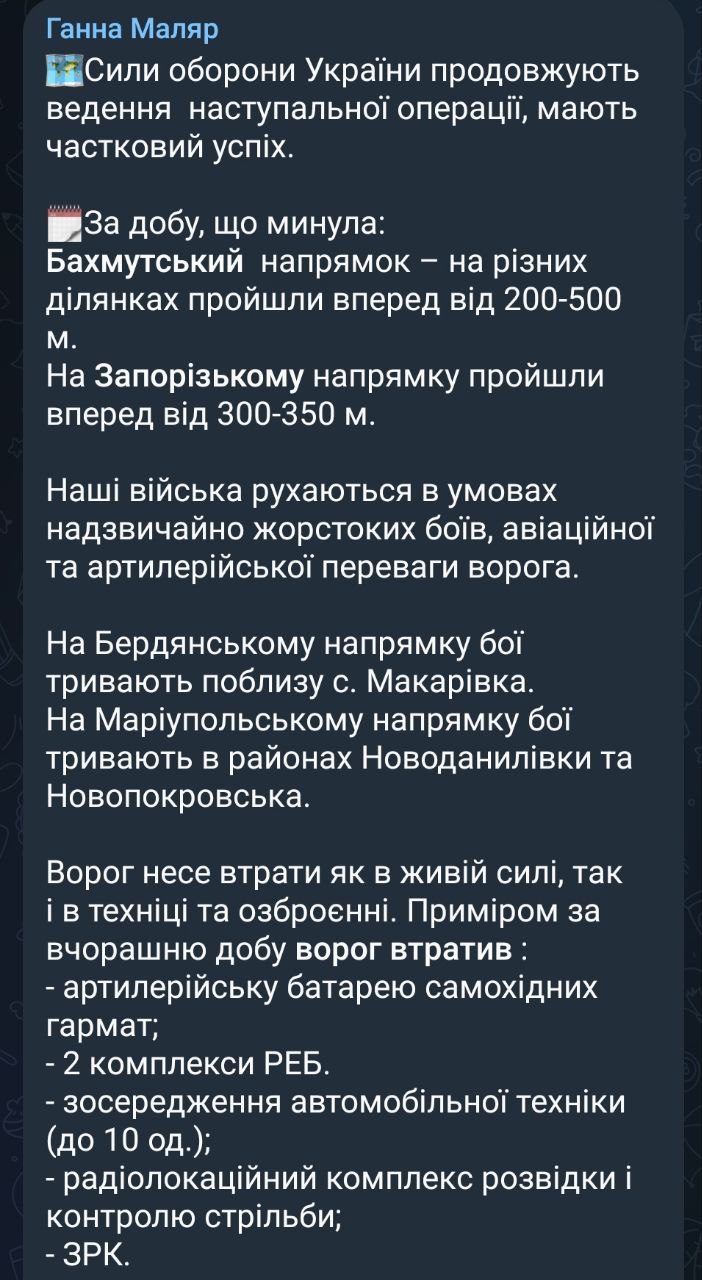 12.50 За минувшие сутки ВСУ продвинулись на юге на 300-350 метров. Об этом заявила замминистра обороны Анна Маляр.