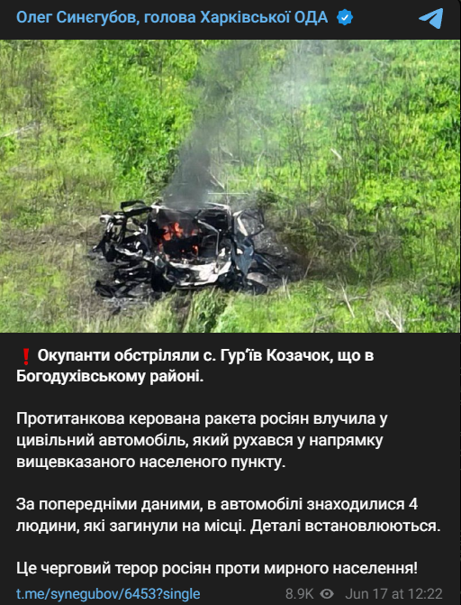 "Противотанковая управляемая ракета россиян попала в гражданский автомобиль, который двигался в направлении вышеуказанного населенного пункта. По предварительным данным, в автомобиле находились 4 человека, погибших на месте. Подробности устанавливаются", - написал Синегубов.