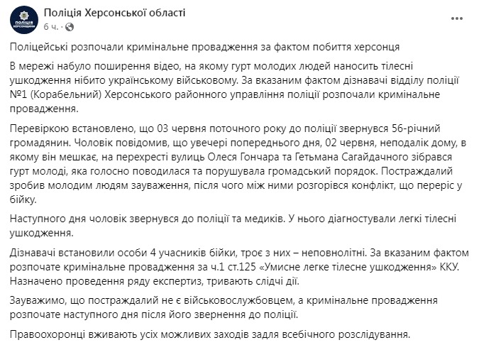 "В сети получило распространение видео, на котором группа молодых людей наносит телесные повреждения якобы украинскому военному. По указанному факту дознаватели отдела полиции №1 (Корабельный) Херсонского районного управления полиции возбудили уголовное производство. Проверкой установлено, что 3 июня в полицию обратился 56-летний гражданин. Мужчина сообщил, что вечером предыдущего дня, 2 июня, недалеко от дома, в котором он проживает, на перекрестке улиц Олеся Гончара и Гетмана Сагайдачного собралась группа молодежи, которая громко вела себя и нарушала общественный порядок. Пострадавший сделал молодым людям замечания, после чего между ними разгорелся переросший в драку конфликт", - сообщили в полиции Херсонской области.