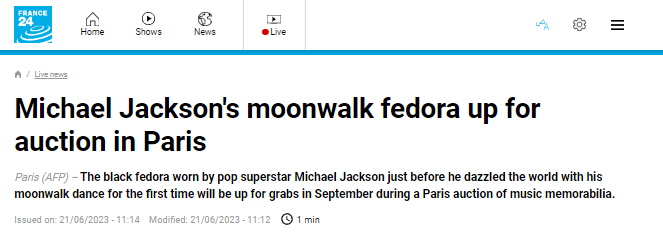 Кроме шляпы Майкла Джексона на площадке парижского аукционного дома будет представлено около 200 лотов. Торги состоятся 26 сентября. Полный каталог предметов будет опубликован на сайте Lemon Auction 4 июля.