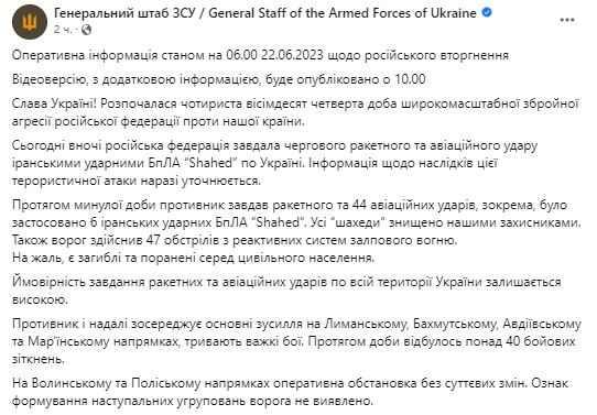 В четверг, 22 июня, Генштаб ВСУ обнародовал сводку о ситуации на фронте.