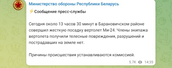 "Сегодня около 13:30 минут в Барановичском районе совершил жесткую посадку вертолет Ми-24. Члены экипажа вертолета получили телесные повреждения, разрушений и пострадавших на земле нет", - говорится в сообщении.
