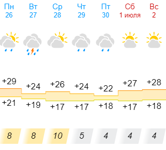 В понедельник, вторник, четверг и пятницу ожидается дождь. Самый сильный – до 7,3 мм осадков – 27 июня.