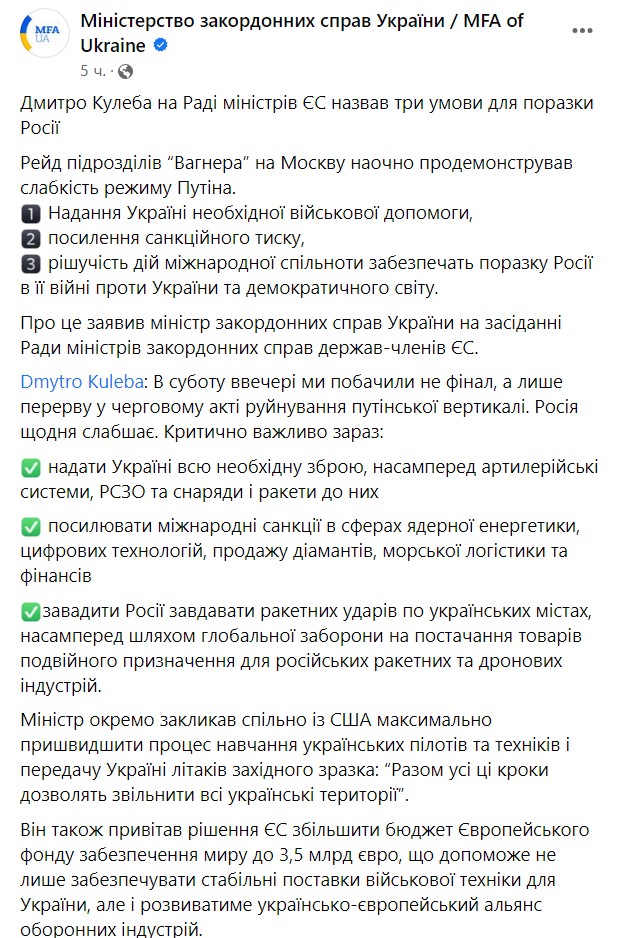 Министр иностранных дел Дмитрий Кулеба заявил, что военный мятеж Пригожина "наглядно показал слабость диктаторского режима Владимира Путина".