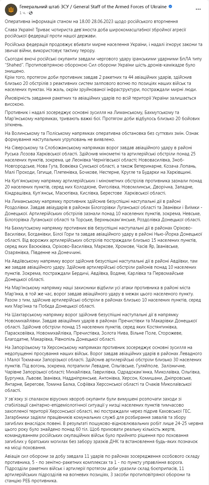 Генштаб ВСУ опубликовал оперативную информацию о российском вторжении по состоянию на 18:00 28 июня.