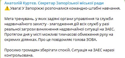 "Просим граждан сохранять спокойствие. Ситуация на ЗАЭС контролируется", - сообщил секретарь горсовета Анатолий Куртев.