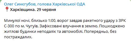 Ночью 29 июня РФ обстреляла из ЗРК С-300 Чугуев в Харьковской области.