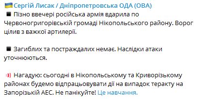 Также поздно вечером силы РФ из тяжелой артиллерии обстреляли Красногригорьевскую громаду Никопольского района Днепропетровской области.