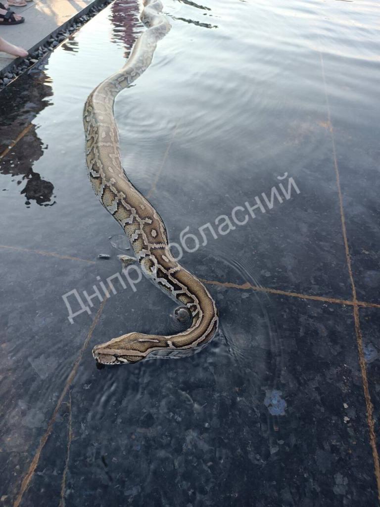 В воскресенье, 2 июля, жители Днепра заметили в сквере "Прибрежный" огромного питона, который плавал в фонтане и грелся на солнце. Оказалось, что это домашняя змея, которую выгуливали хозяева.