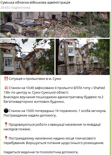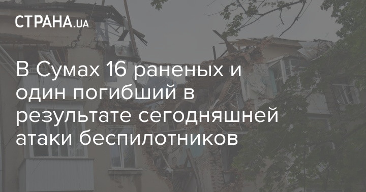 В Сумах сообщают о 16 раненых и одном погибшем в результате сегодняшней атаки беспилотников.