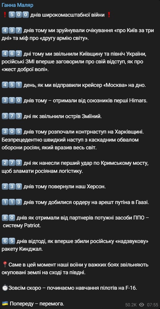 497 дней назад "мы разрушили ожидания "о Киеве за три дня" и миф о "второй армии мира"", написала Маляр.
