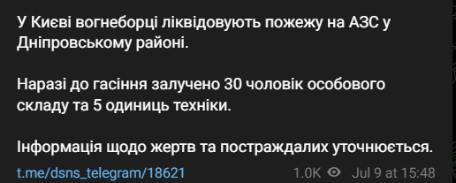 "В Киеве пожарные ликвидируют пожар на АЗС в Днепровском районе. В настоящее время к тушению привлечены 30 человек личного состава и 5 единиц техники. Информация о жертвах и пострадавших уточняется", - сообщают в ГСЧС.