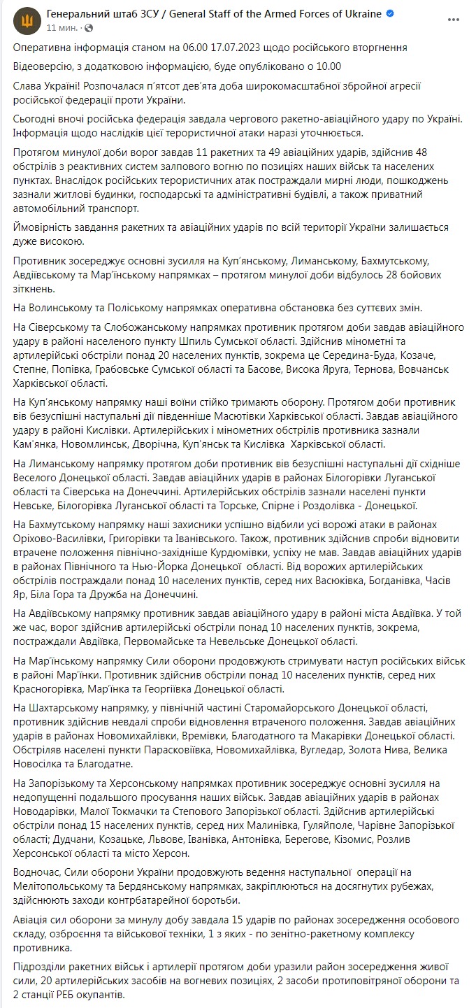 Сводка Генштаба ВСУ по состоянию на 18:00 17 июля 2023 года
