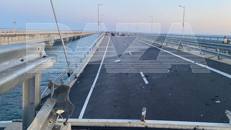 В сети появились первые фото крупным планом повреждений на Крымском мосту вследствие ночного взрыва.