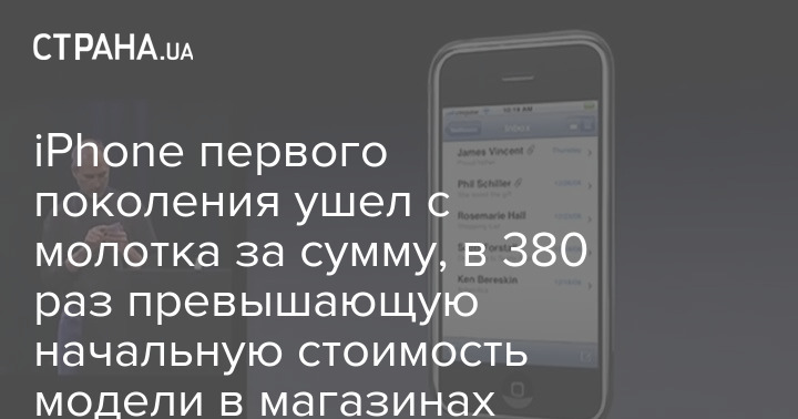 Аукционный дом LCG Auctions продал смартфон iPhone первого поколения с памятью в 4 ГБ за 190 тысяч долларов, что в 380 раз превышает изначальную цену этой модели iPhone (в 2007 году ее цена в магазинах была 499 долларов).