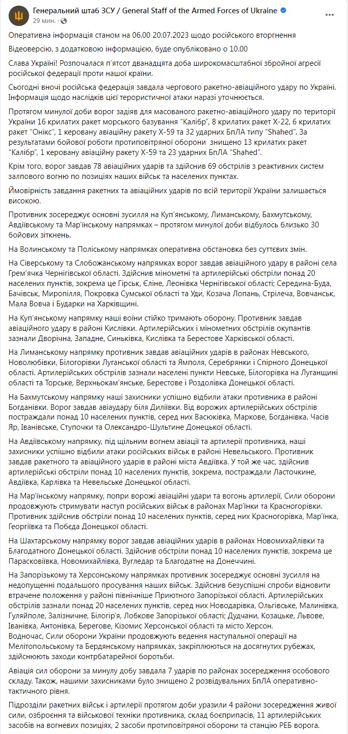 В четверг, 20 июля, в Украине идет 512-й день войны с Россией.