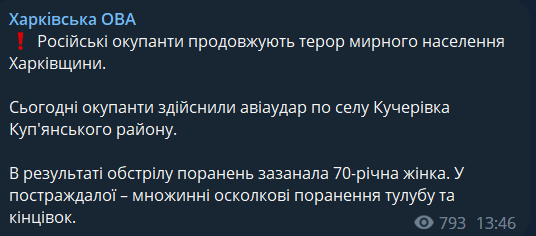 Сегодня российские войска нанесли авиаудар по селу Кучеровка Купянского района Харьковской области.