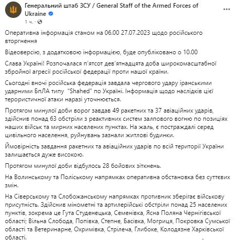 Утром 27 июля Генштаб ВСУ обнародовал сводку о ситуации на фронте.