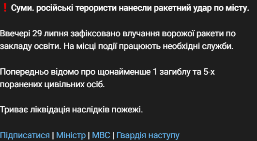"Вечером 29 июля зафиксировано попадание вражеской ракеты по учебному заведению. На месте происшествия работают необходимые службы", - говорится в сообщении.