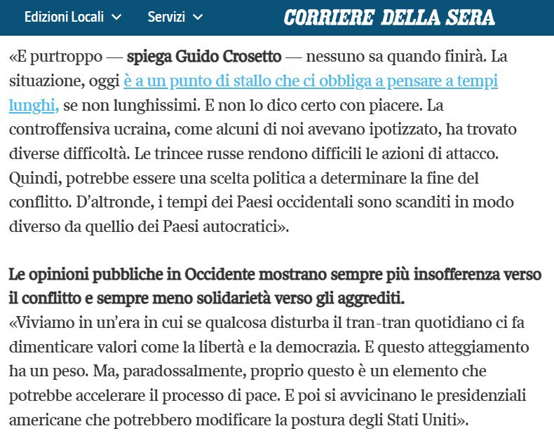 "Сегодняшняя ситуация зашла в тупик, что заставляет нас задуматься о длительных, если не очень долгих сроках (завершения войны - Ред.)... Украинское контрнаступление, как некоторые из нас предполагали, столкнулось с рядом трудностей. Российские окопы затрудняют наступательные действия. Поэтому может быть политический выбор, определяющий окончание конфликта", - заявил Крозетто.