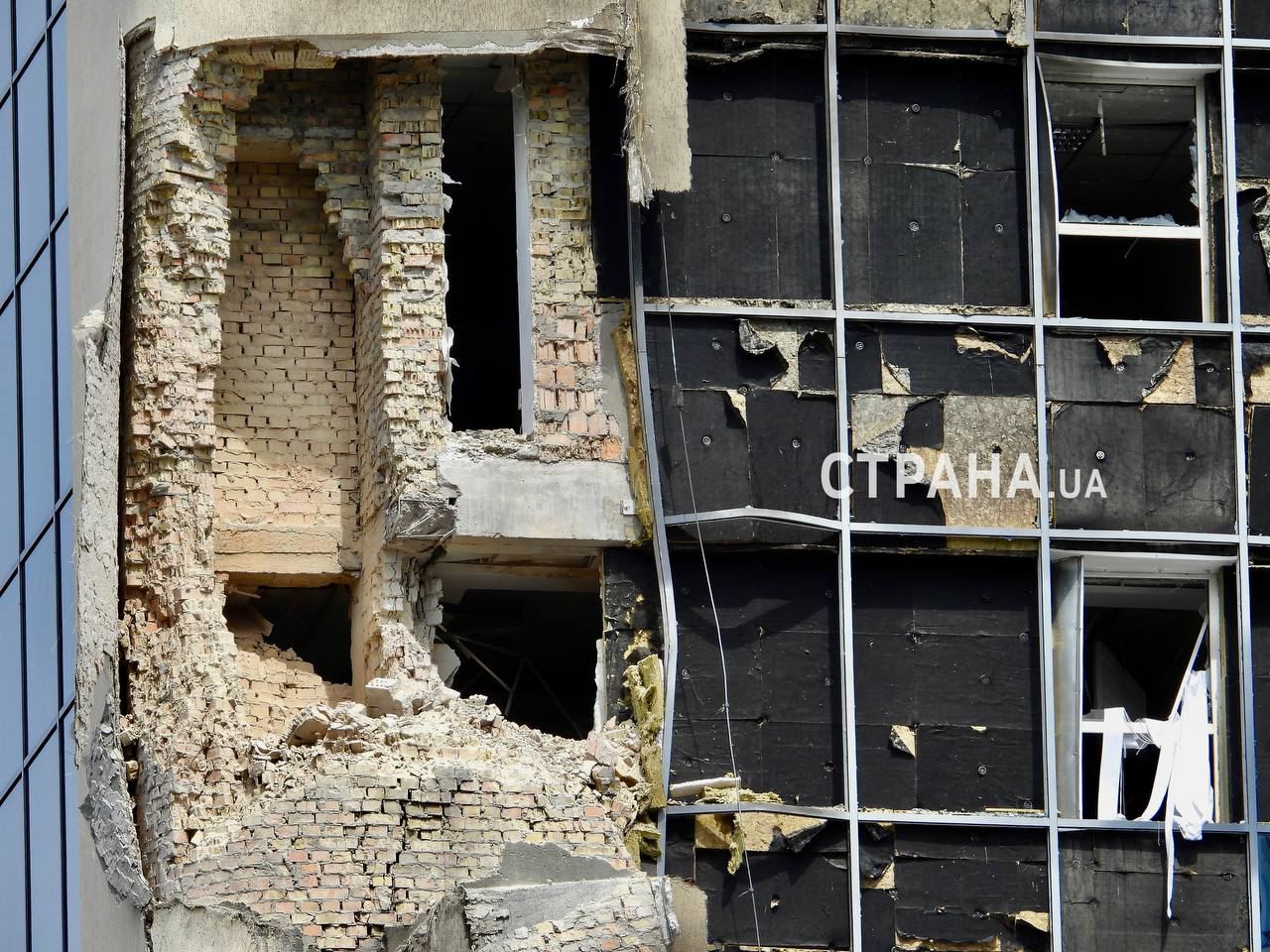 В Соломенском районе Киева после атаки "Шахедов" поврежден фасад административного здания с 9 по 11 этаж. Также осколками от взрыва выбило окна в соседних домах и магазинах.